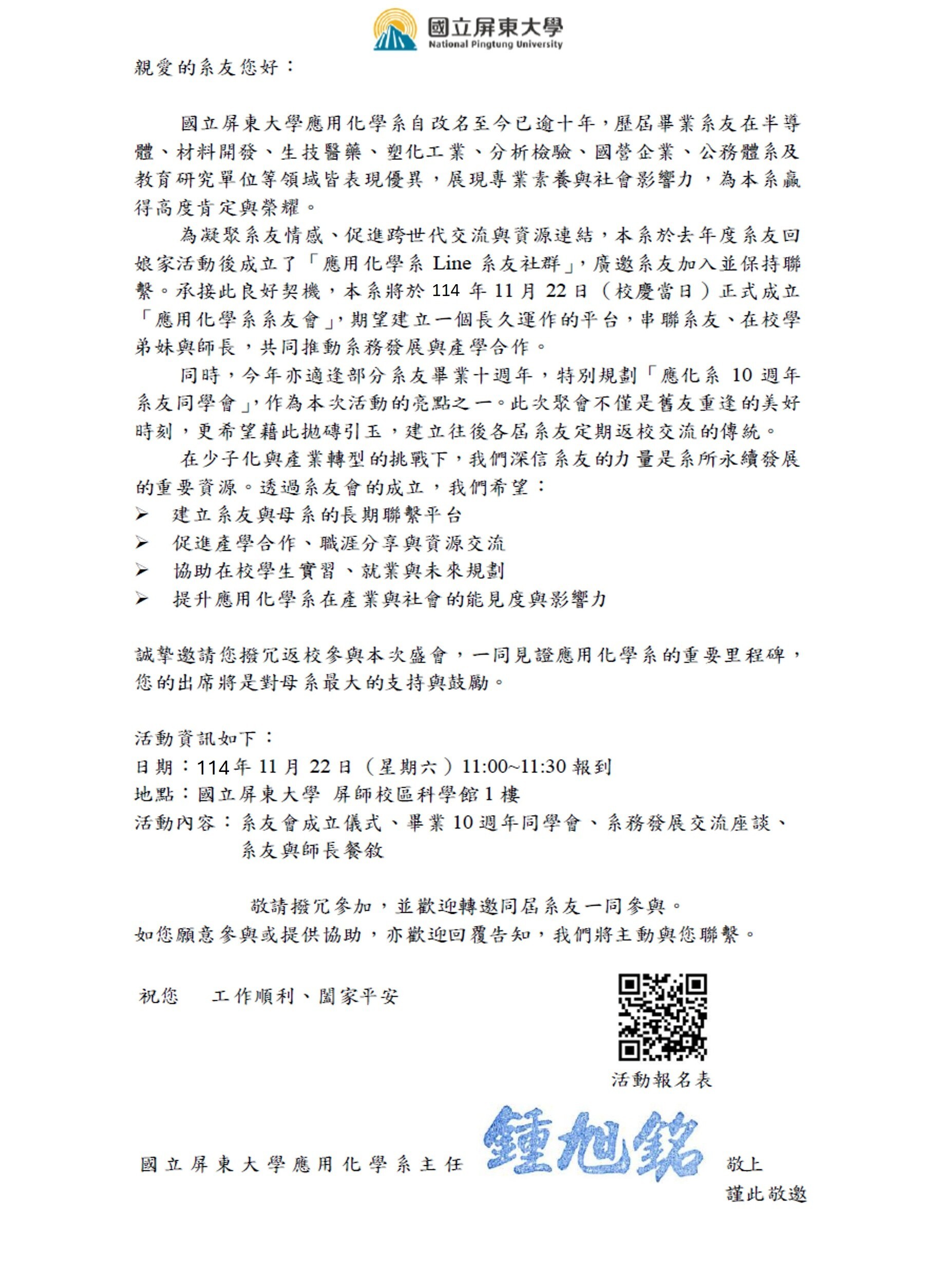 【歡迎報名】11月22日(六)「應用化學系畢業10週年系友回娘家暨系友會成立餐會」